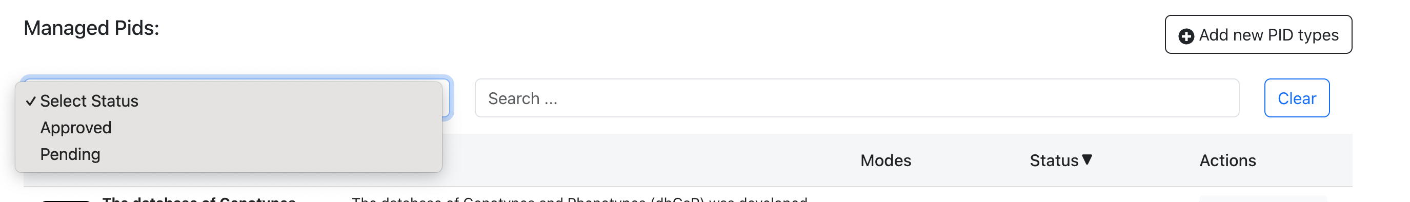 Users can search for PIDs by entering keywords in the search auto-complete field. The search function is performed across the fields that describe the PID type.
